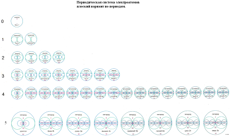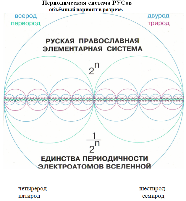 (РУС 2), который содержит в объёме на горизонтальном диаметре два шарообразных электронейтральных электроатома всерод, радиус которых в два раза меньше предыдущего и т. д, получаем построение 255 электроатомов, 255 электроатом включает все электроатомы и является Периодической Системой с образованием 8-ми периодов (однородов): всерод, первород, двурод, трирод, четырерод, пятирод, шестирод, семирод, 128 рядов (разнородов). На Рис 1 показано, что каждый последующий электроатом в периоде содержит в себе предыдущий и отличается от него на один электроатом в структуре, что и определяет изменение его свойств в периоде (однороде). Расшифровка аббревиатуры РУС.- Равноправная Устойчивая Система (Симметрия).