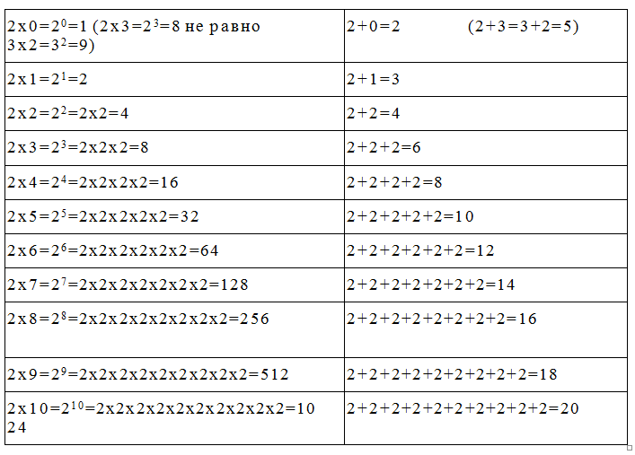 Из таблиц ОЧЕВИДНО не вооружённым глазом, что результаты умножения и суммирования, значительно отличаются, и при соответствующей проверке на логическую и математическую совместимость с определениями СУММА-СУММИРОВАНИЕ, со знаками«+» «-», и ПРОИЗВЕДЕНИЕ-УМНОЖЕНИЕ-ВОЗВЕДЕНИЕ В СТЕПЕНЬ со знаком «×» с учётом основных свойств (признаков) не вызывают сомнений в правильности математических действий и результатов. В СЭС [2] три определения математических действий (операций) не вызывают сомнений, так как там отсутствуют противоречия, а вот в определение УМНОЖЕНИЕ введено очевидное противоречие. «Умножение, арифметическое действие. Обозначается точкой или знаком «×» (в буквенном исчислении) знаки У. опускаются. У. целых положительных чисел (натуральных чисел) есть действие, позволяющее по двум числам а (множимому) и b (множителю) найти третье число ab (произведение), равное «сумме b слагаемых?» каждое, из которых, равно «а»[2]. Переопределение математических операций в словах соответственно ведёт к изменению операций (действий) пример: сложить+сложить+сложить=слож; складываем+складываем+складываем = склад; суммируем+суммируем+суммируем = сумма; при этом производится счёт предметов или численно-цифровых символов. В статье Родовые объёмные знания РУСов[4] представлены примеры таблицы УМНОЖЕНИЯ (ВОЗВЕДЕНИЯ В СТЕПЕНЬ) и параллельно СУММИРОВАНИЯ, а также правила счёта, где отсчёт начинается с ноля, а таблицы показывают суммирование и умножение начало операций (действий) с единицы. Древний счёт РУСов[4]: выбор и уменьшение единицы при двоичном счёте - ноль-0 (выбор единицы) целковый-1, полушка-1/2, четвертушка-1/4, осьмушка-1/8, пудовичок-1/16, медячок-1/32, серебрячок-1/64, золотничок-1/128;и т. д. – выбор и увеличение единицы: ноль-0(выбор единицы), целковый-1, одна пара-2, две пары-4, четыре пары-8, восемь пар-16, шестнадцать пар-32, тридцать две пары-64, шестьдесят четыре пары 128, сто двадцать восемь пар-256, двести пятьдесят шесть пар-512, пять сот двенадцать пар-1024.