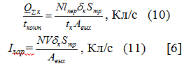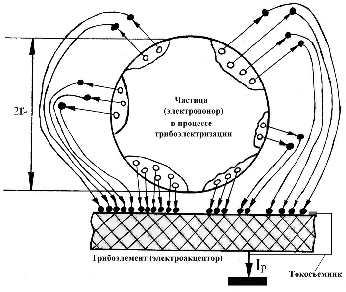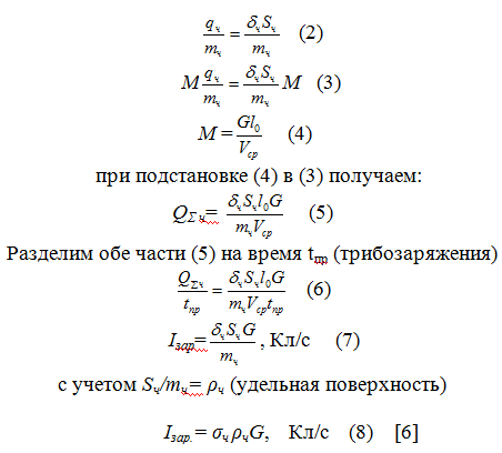 где, qч - заряд на частице, δч - поверхностная плотность заряда, Sч - поверхность частицы, mч - масса (количество) частиц, M - суммарное количество одновременно заряжаемых частиц, G - расход частиц из питателя, l0 - расстояние торможения (трения), Vср. - средняя скорость пролета расстояния при торможении частицы, tпр. - время торможения частицы при трибоэлектризации, QΣч - суммарный заряд одновременно трибоэлектризуемых частиц, Iзар - ток зарядки (электризации), ρч - удельная поверхность частицы.