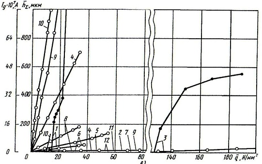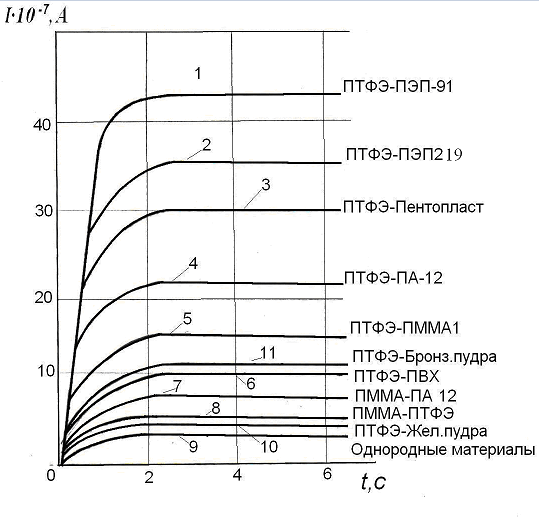 Наибольший электроизнос и токи утечки дают трибопары незакалённых металлов с вводом сухого графита на полимерный слой из твёрдого диэлектрика Рис.3 (графики 9,10); средние значения электроизноса и токов утечки дают трибопары с диэлектрическим абразивом (кварцевый песок) на полимерном слое твёрдого диэлектрика (графики 5, 6, 7, 8); минимальный электроизнос и токи утечки дают трибопары с твёрдым диэлектриком со смазкой (графики 3,11,12) при максимальных стандартных нагрузках соизмеримых с пределом текучести металлов.