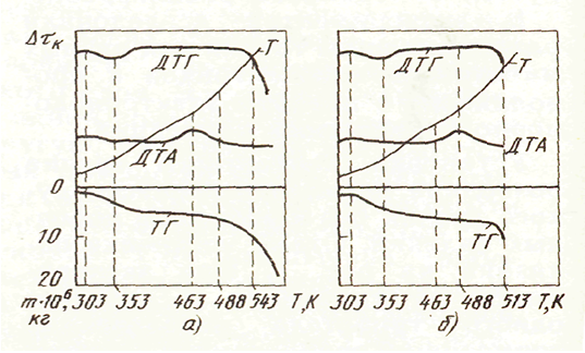 Графики получены на дериватографе Ф. Паулик, Дж. Паулик, Л. Эрдей. Контрольные образцы порошка П-ЭП-219 4(а) и трибоэлектризованные образцы 4(б)